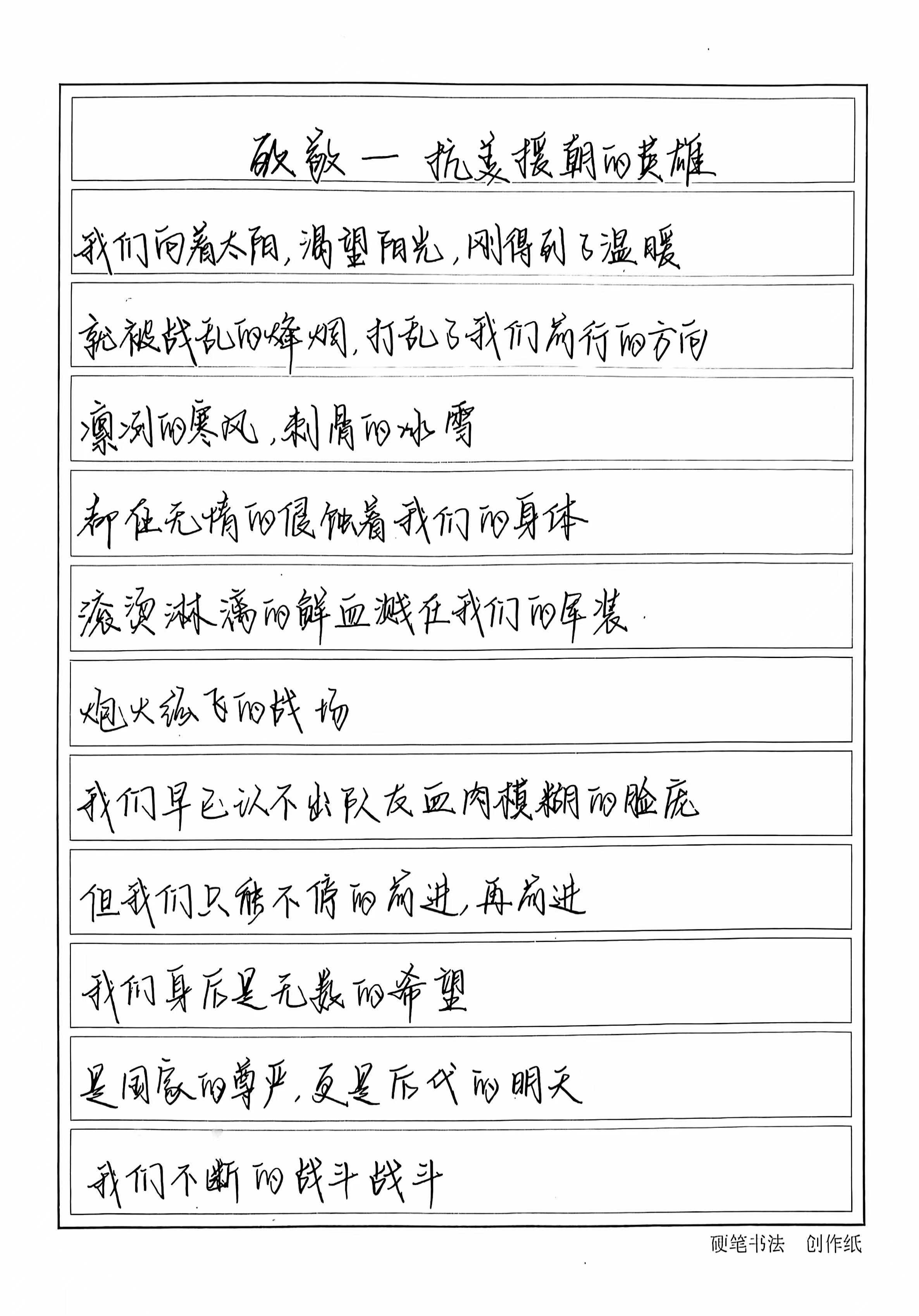 为贯彻落实习近平总书记在纪念中国人民志愿军抗美援朝出国作战70周年大会上的讲话精神,引领广大青年铭记历史,缅怀先烈,传承和弘扬伟大的抗美援朝精神,同时也为了弘扬中华民族的优秀传统文化,繁荣书法绘画艺术,提高员工的艺术修养、审美情趣。近日,我系举办“翰墨飘香”弘扬抗美援朝精神书画大赛活动